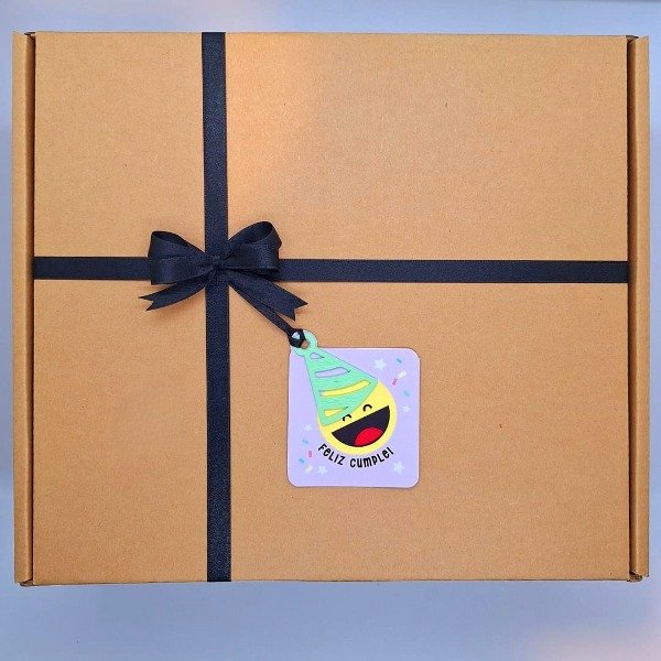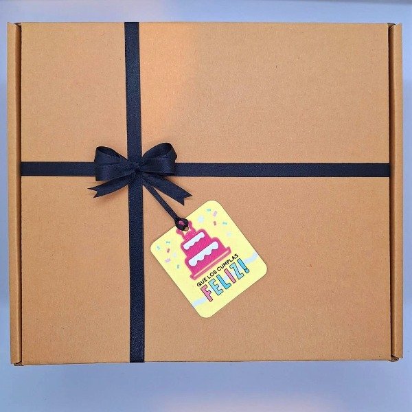 Caja mediana color marrón con detalles en color: 23 x 27 x 10 cm.