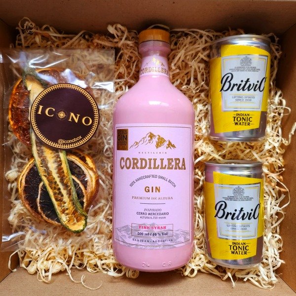 Caja contenedora Gin Cordillera Syrah + tónica Britvic + cítricos