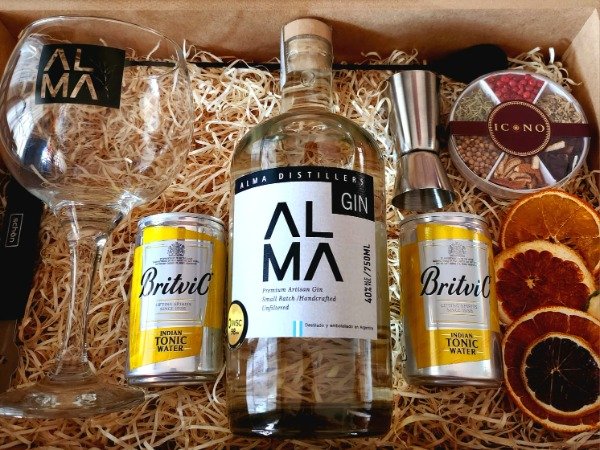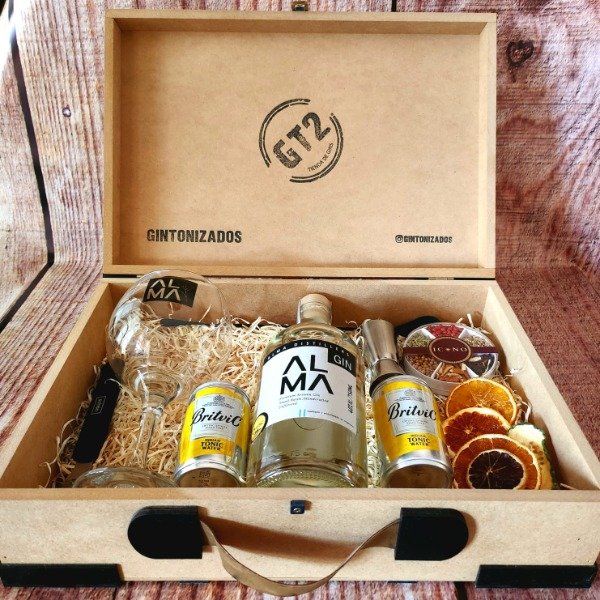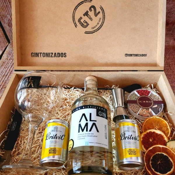 Valija de madera grande, detalles en color negro. Incluye: Alma gin, tónicas Britvic, cuchara cóctel, zester, rodajas cítricos Icono, botánicos icono + copon Alma Gin.